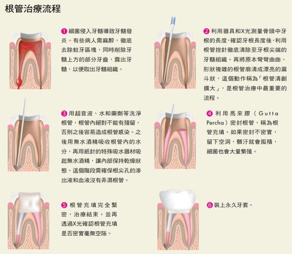 許多人常把根管治療跟「抽神經」劃上等號,實際上並不完全相同是,因為牙髓中不單是只有神經而已,還有血管及其他組織,而完整的根管治療不只是把神經抽掉而已,還包括根管的清創、擴大、充填等複雜及緻的步驟。